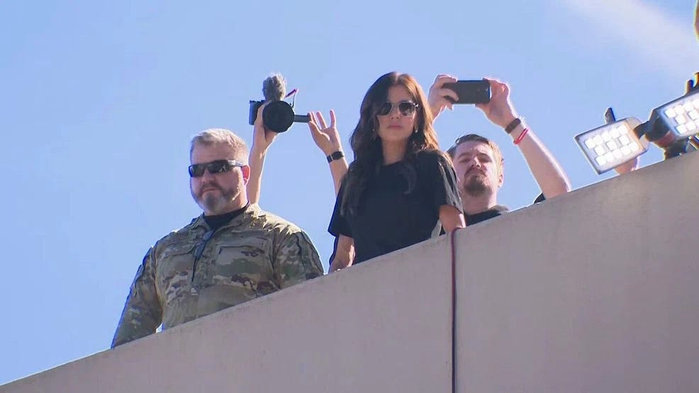 The day before Sortor attended the White House roundtable, former U.S. Homeland Security Secretary Kristi Noem, affectionately known as the “ICE Barbie” for her many costumes—variously cosplaying as Rambo, a nurse, firefighter, dentist, pilot, Marine, prison warden, Coast Guard, and other personalities in her public appearances and ad campaigns (the last of which allegedly funneled $220 million of DHS taxpayer money to film a commercial of Noem in front of Mt. Rushmore on horseback, dressed as a cowgirl, warning illegal immigrants, “Break our laws, we’ll punish you”)—made another appearance, on the roof of the Portland ICE facility. This time, dressed in understated tactical black and sunglasses.