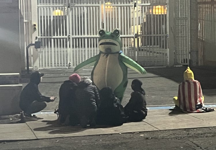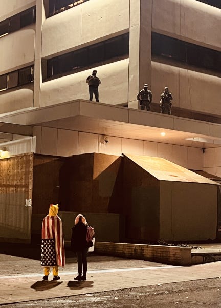 Observing minuscule protests developing outside of Portland’s Immigration and Customs Enforcement facility last October, where people in various costumes—frog suits, “We Are Charlie Kirk” T-shirts—were signaling to, and live-streaming, one another.
